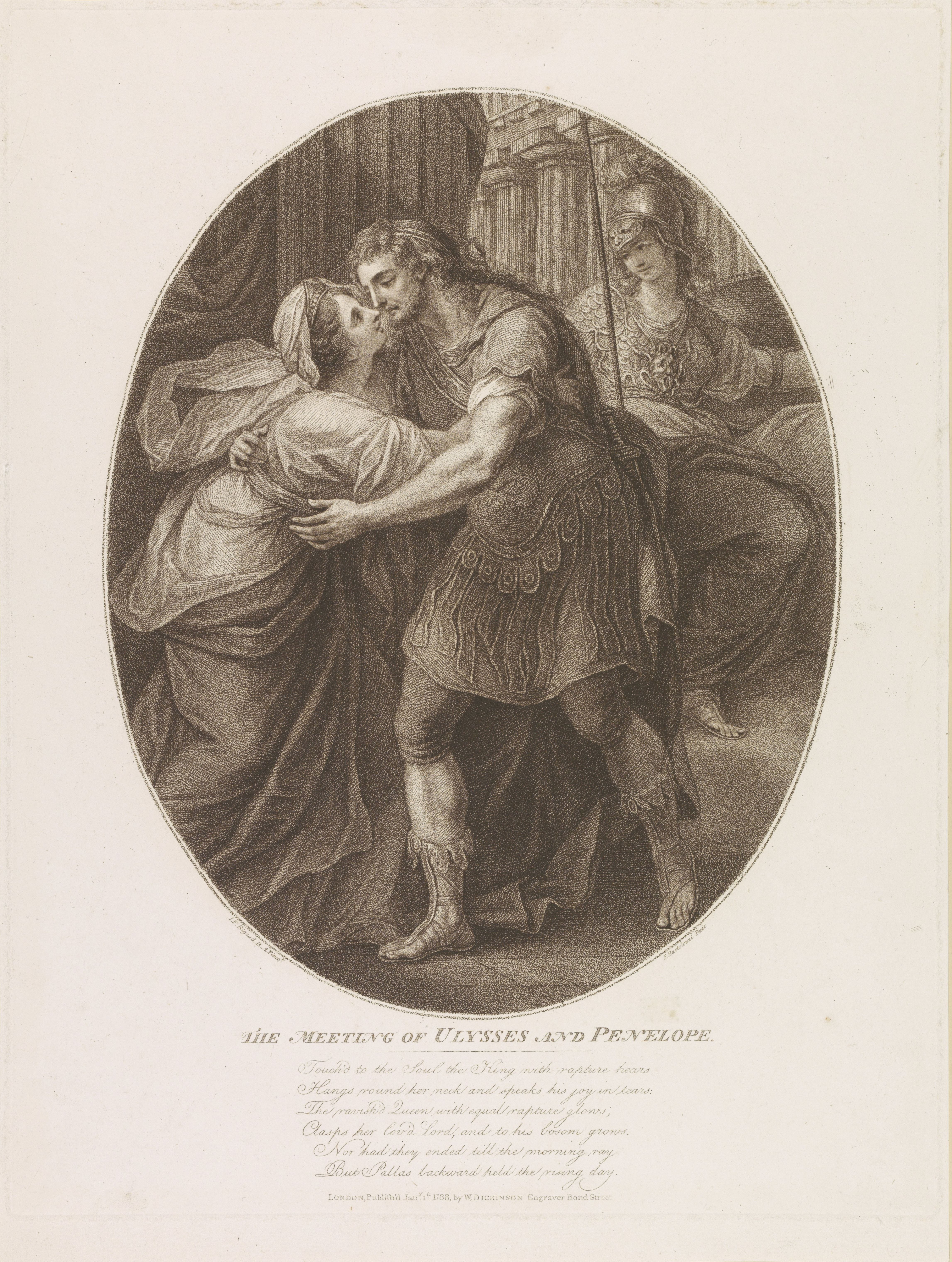 With eyes brimming tears she ran to him, throwing her arms around his neck, and kissed him, Translated by Robert Fitzgerald